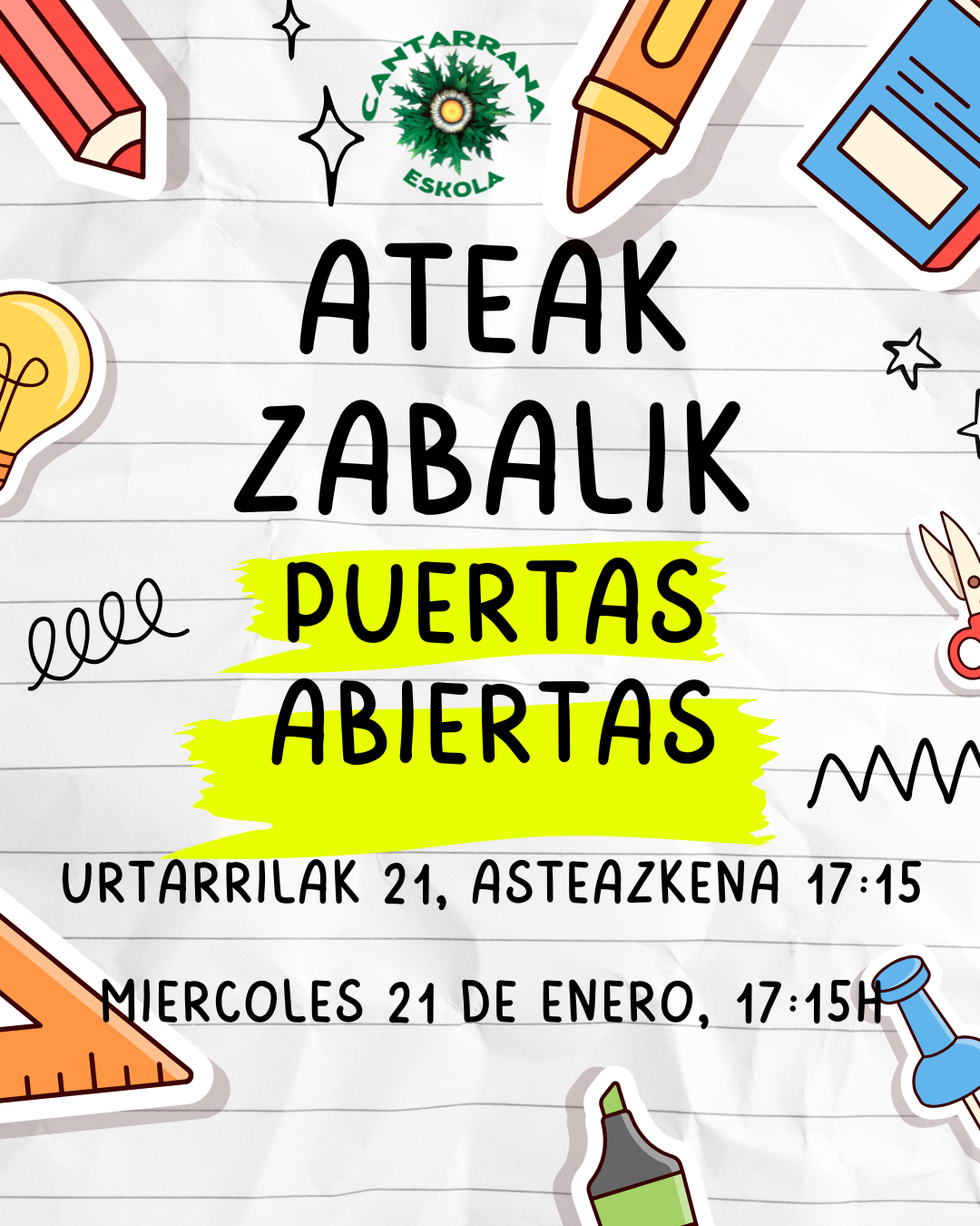 Gure Eskola ezagutu dezazuen ateak zabalik izango ditgu datorren urtarrilaren 21ean, asteazkena, arratsaldeko 17:15etan.